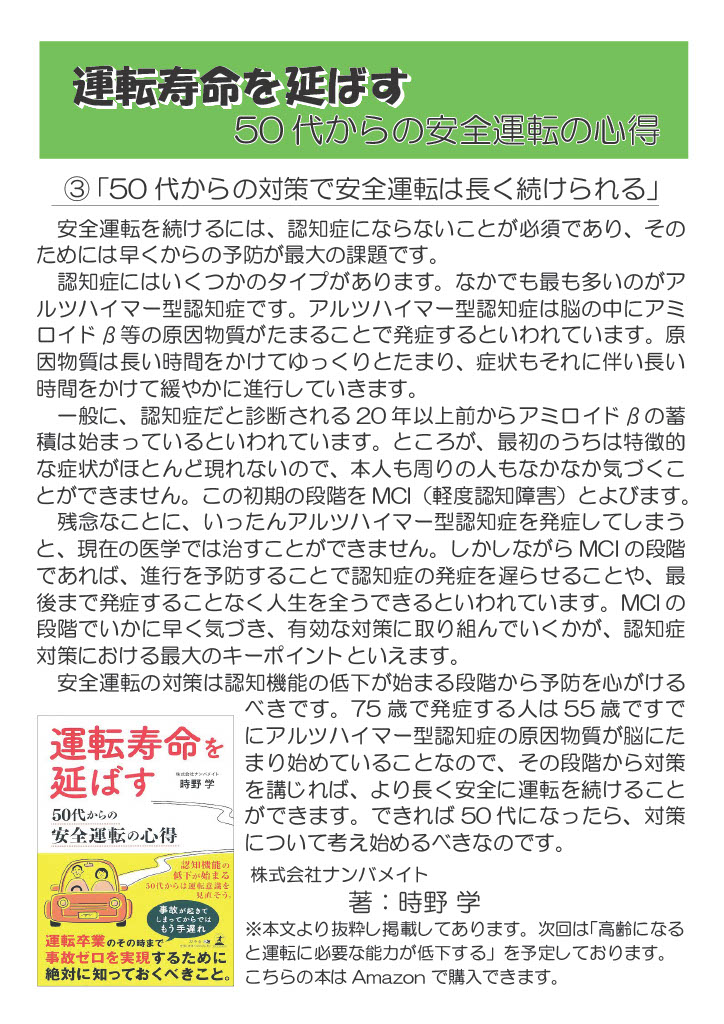 早くから安全運転に必要な知識や心得などを知り、ご自身の運転寿命を延ばす必要があります。ここでは、「運転寿命を延ばす50代からの安全運動の心得」の本文より何回かに分け項目ごとに紹介していきます。今回は、③「50代からの対策で安全運転は長く続けられる」です。添付画像を拡大してお読みください。