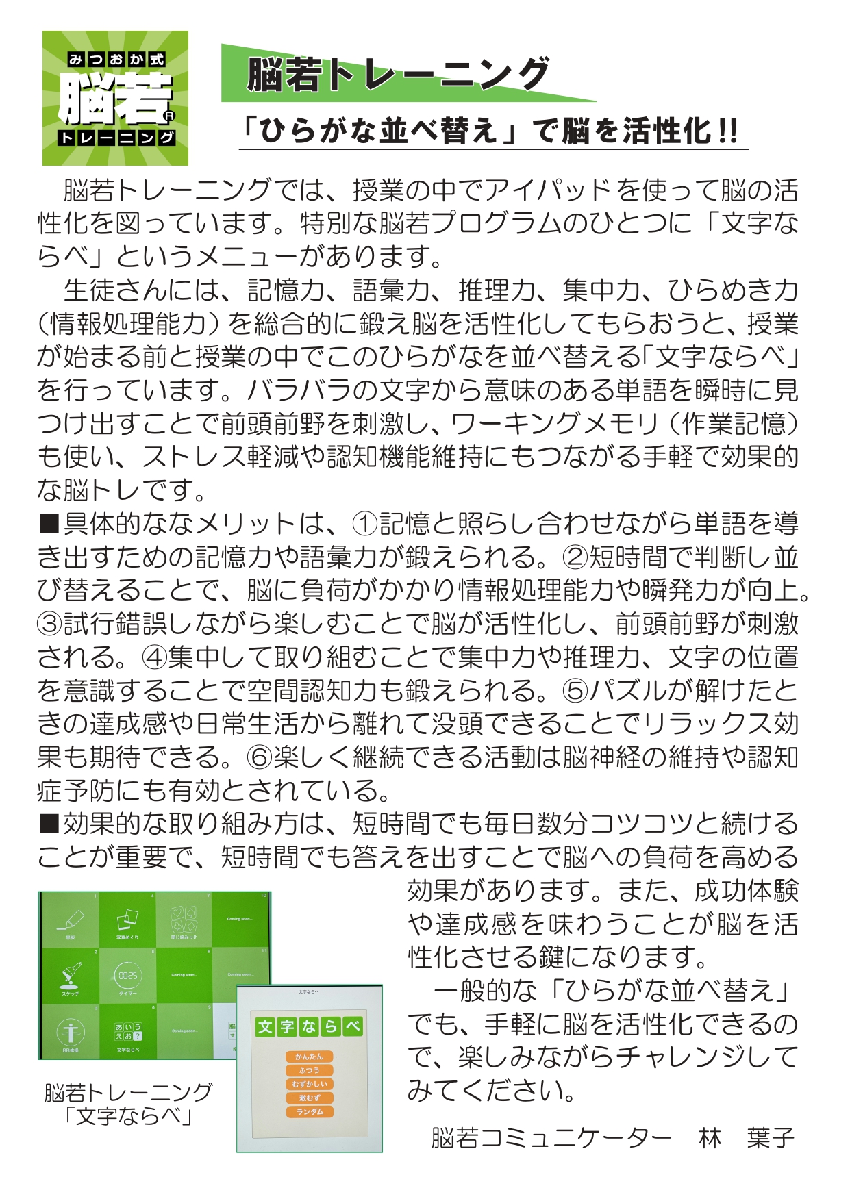 生徒さんには、記憶力、語彙力、推理力、集中力、ひらめき力(情報処理能力)を総合的に鍛え、脳を活性化してもらおうと、授業が始まる前と授業の中でひらがなを並べ替える「文字ならべ」を行っています。バラバラの文字から意味のある単語を瞬時に見つけ出すことで前頭前野を刺激し、ワーキングメモリ(作業記憶)も使い、ストレス軽減や認知機能維持にもつながる手軽で効果的な脳トレです。一般的な「ひらがな並べ替え」でも、手軽に脳を活性化できるので、楽しみながらチャレンジしてみてください。※詳細は画像を大きくしてご覧下さい。